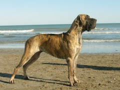 Nuestra historia comienza en el año 2005, Pablo, mi novio, me regaló una preciosa hembra negra de azul llamada Fátima de meneses. Cara (Querida en italiano) que es como la rebautizamos debido a su ascendencia italiana por parte de padre,pasó a formar parte de nuestra familia. Desde el principio toda mi familia se implicó en el cuidado de nuestros perros, cada uno tiene su función. Quiero dar las gracias en primer lugar a mis padres,sin ellos esto no podría salir adelante; Todavía recuerdo las lagrimas de emoción de mi madre en la Exposición de Valladolid donde nuestra Cara ganó por primera vez, ella se encarga de las relaciones públicas, mi padre como yo le llamo es el patrocinador junto con mi madre se encargan de que a los perros no les falte nada, pienso, mantas para el invierno,collares, concursos, veterinario, viajes... y un largo etc de cosas, entre ellas consentirlos y mimarlos por encima de todo. Jose, el novio de mi hermana, junto con Pablo, se encargan del entrenamiento de los perros, se los llevan a correr, intentan enseñarles como plantarse en las exposiciones...Mi hermana, Mª Carmen (Bombo, para la familia), es como la "tía" perruna, les da mimos, que para eso están las "tias". Pablo me aconseja en cosas técnicas, tiene mucho ojo en sementales,reproductoras y cosas por el estilo, también está ahí para ayudarme cuando yo tengo clase o prácticas en la facultad y no puedo darles una de sus tres comidas o su paseo diario, nos acompaña a todas las exposiciones y corre como el que más en el ring. No puedo olvidarme de mi abuela que aguanta pacientemente los lametones que reparten a diestro y siniestro. Por último estoy yo, parece que ya no me queda nada por hacer, digo parece, porque con ellos no se para en todo el dia, entre otras cosas, me toca ponerme dura con su educación, pues con el resto de la familia hacen lo que quieren, estoy todo el día pendiente de ellos, de sus comidas, de sus visitas al veterinario, de sus vacunas, de los proveedores del pienso, de evitar que se coman sus camas,que no hagan un agujero en el cesped de tal calibre que parece que van a llegar a Australia por el otro lado, que no cojan a su amigo Andrés ( el gato) y lo llenen tanto de babas que haya que lavarlo y ese tipo de nimiedades que los propietarios de un dogo alemán conecerán a la perfección. Espero que este proyecto de futuro siga adelante tan bien como va de momento, que sigamos disfrutando de la crianza de los cachorros, de verlos nacer, crecer e irse con sus nuevos propietarios ( que los quieren tanto o más que nosotros) y que nos den tantas alegrías como de momento nos han dado.